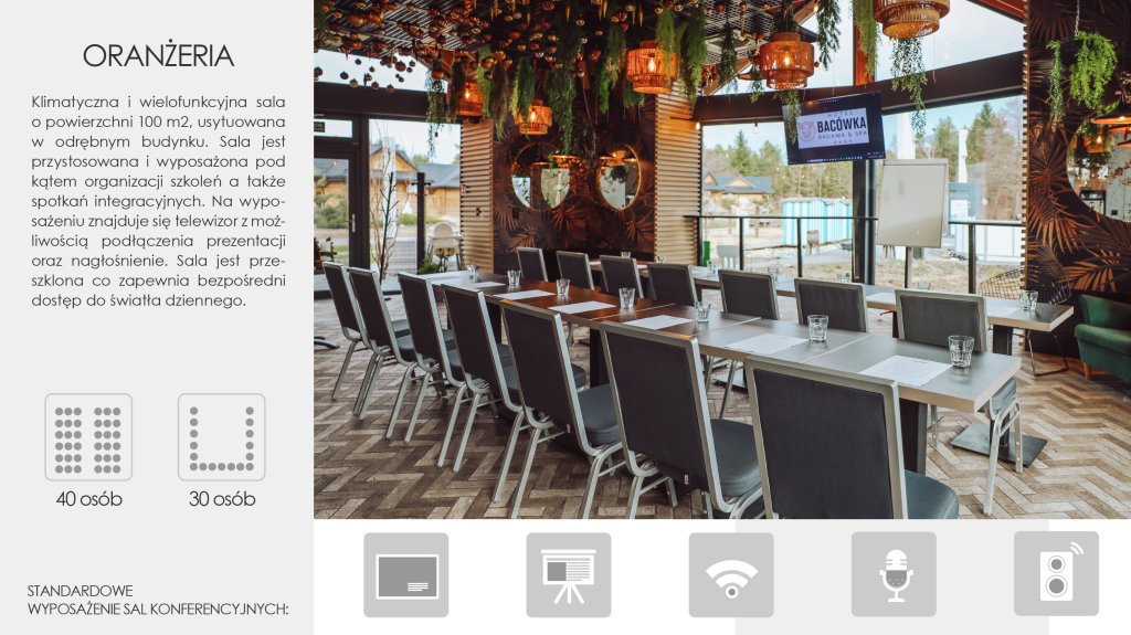 Oranżeria o powierzchni 100 m² to klimatyczna, przeszklona i mała sala w osobnym budynku, która oblewa się naturalnym światłem przez cały dzień. To doskonałe miejsce na szkolenia, warsztaty i spotkania integracyjne, w których chcemy połączyć profesjonalny charakter z bliskością zieleni. Oranżeria idealnie się sprawdza podczas organizacji imprez okolicznościowych – kameralnych wesel, urodzin, chrzcin oraz przyjęć komunijnych.