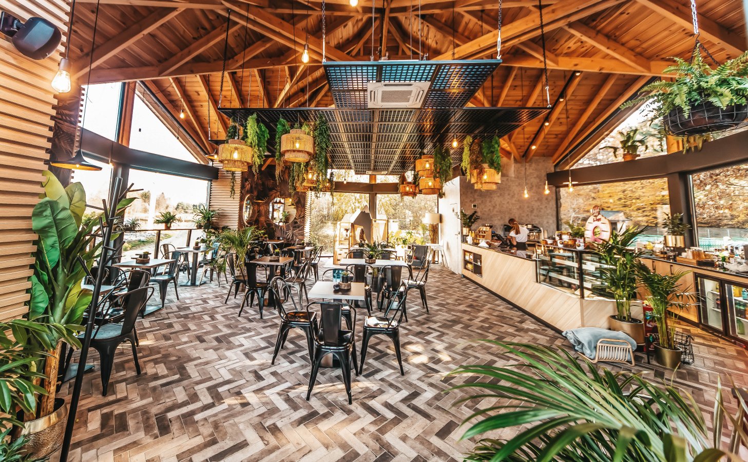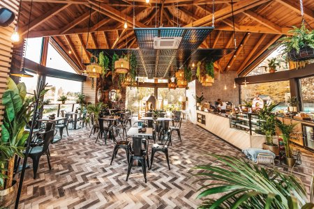 Wnętrze wyróżnia się elegancką aranżacją – przeszklone ściany wpuszczają mnóstwo naturalnego światła, a oryginalne dekoracje z roślinnością i designerskim oświetleniem tworzą niepowtarzalny nastrój. To miejsce, które sprzyja zarówno pracy w skupieniu, jak i swobodnym rozmowom podczas mniej formalnych wydarzeń, np. jako miejsce na chrzciny.