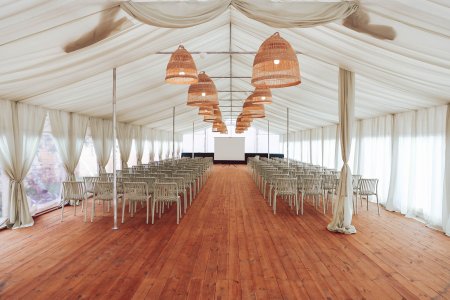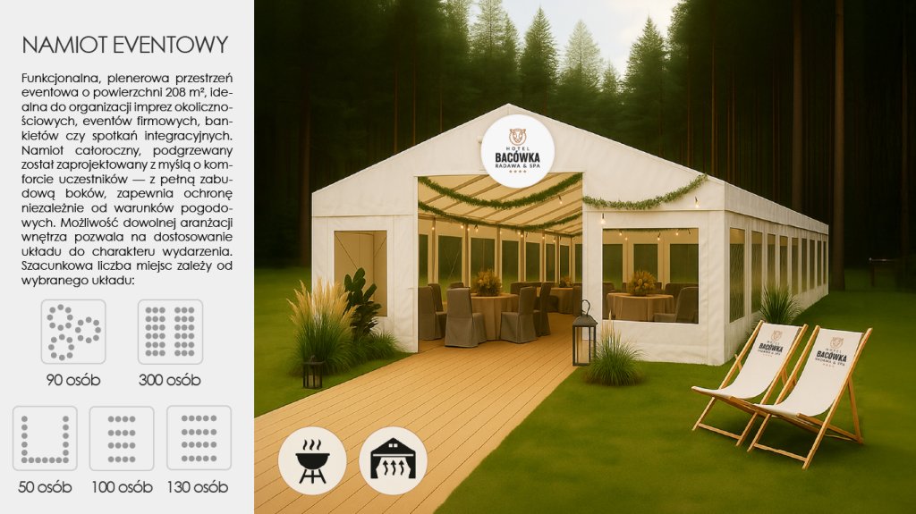 W samym sercu sosnowych lasów, w okresie wiosenno–letnim, istnieje możliwość zorganizowania wydarzenia w eleganckim namiocie ustawianym specjalnie dla Gości marzących o uroczystości pod rozgwieżdżonym niebem. To wyjątkowe rozwiązanie sprawia, że każda okazja – od ślubu, przez bankiet, po spotkanie firmowe – zyskuje niepowtarzalny klimat i bliskość natury.