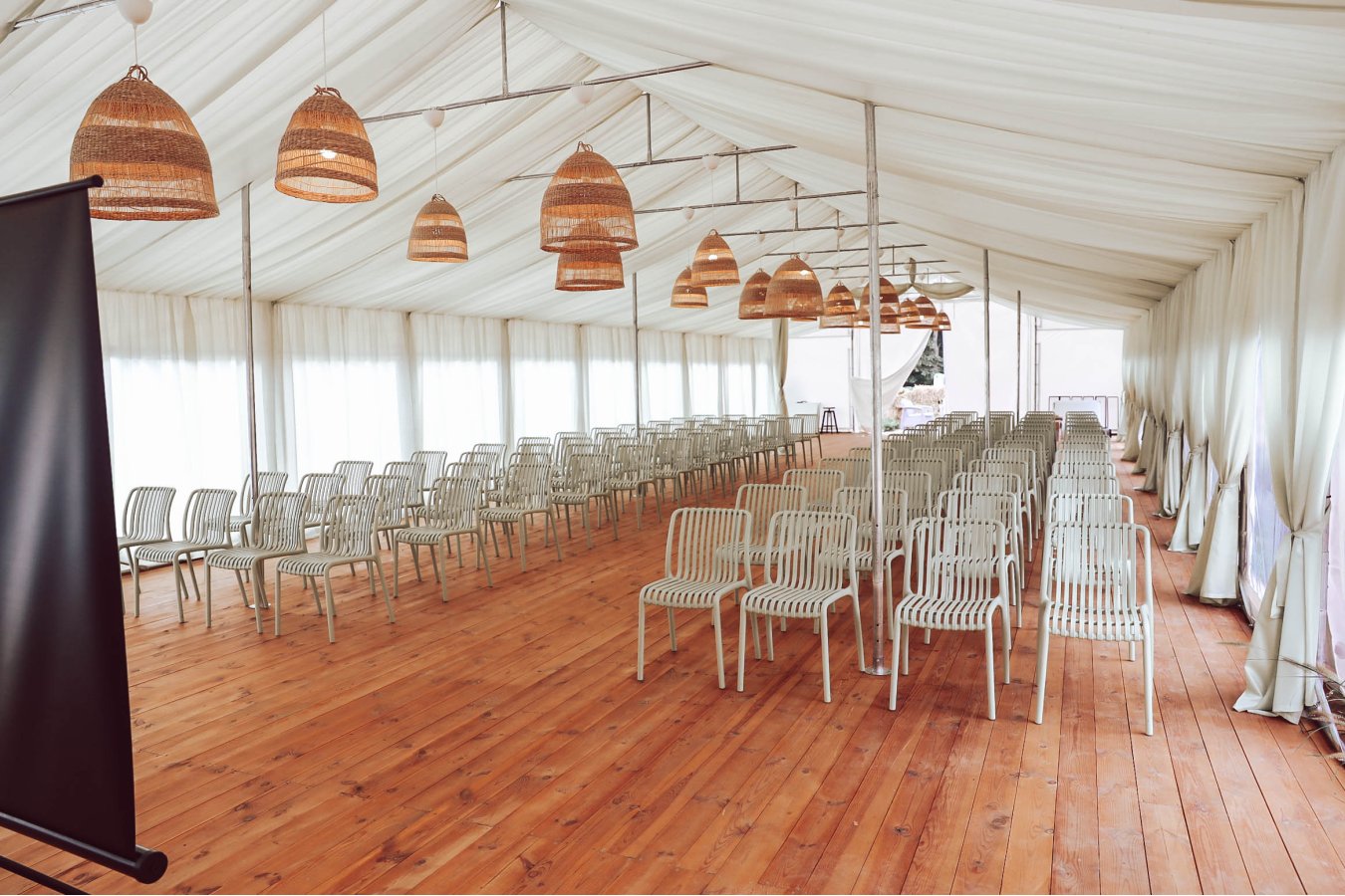 Funkcjonalna przestrzeń o powierzchni 208 m² została zaprojektowana tak, by łączyć komfort z estetyką. Całoroczny, podgrzewany namiot z pełną zabudową boków zapewnia ochronę przed zmiennymi warunkami atmosferycznymi, a jednocześnie stwarza przytulną atmosferę.
